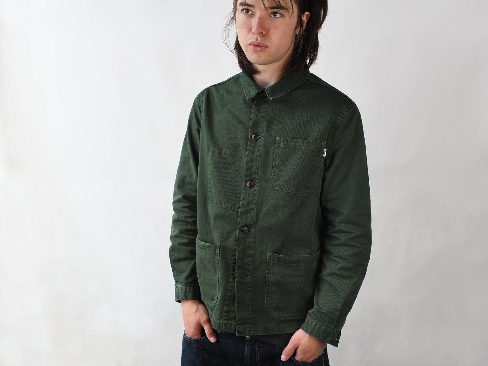 Vintage washed Olive Green drill Chore jacket. Good for work, good for play. Three external pockets and One internal. 10oz Cotton Drill. Pre-shrunk and heavily washed. Ready to roll. Made in Melbourne.